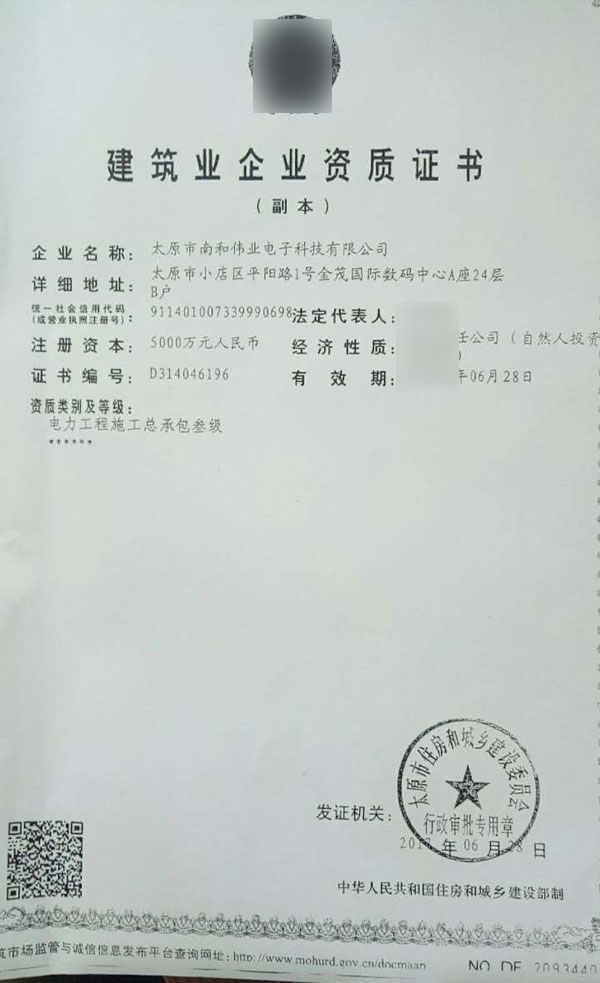 太原某公司電力施工專業總承包資質
